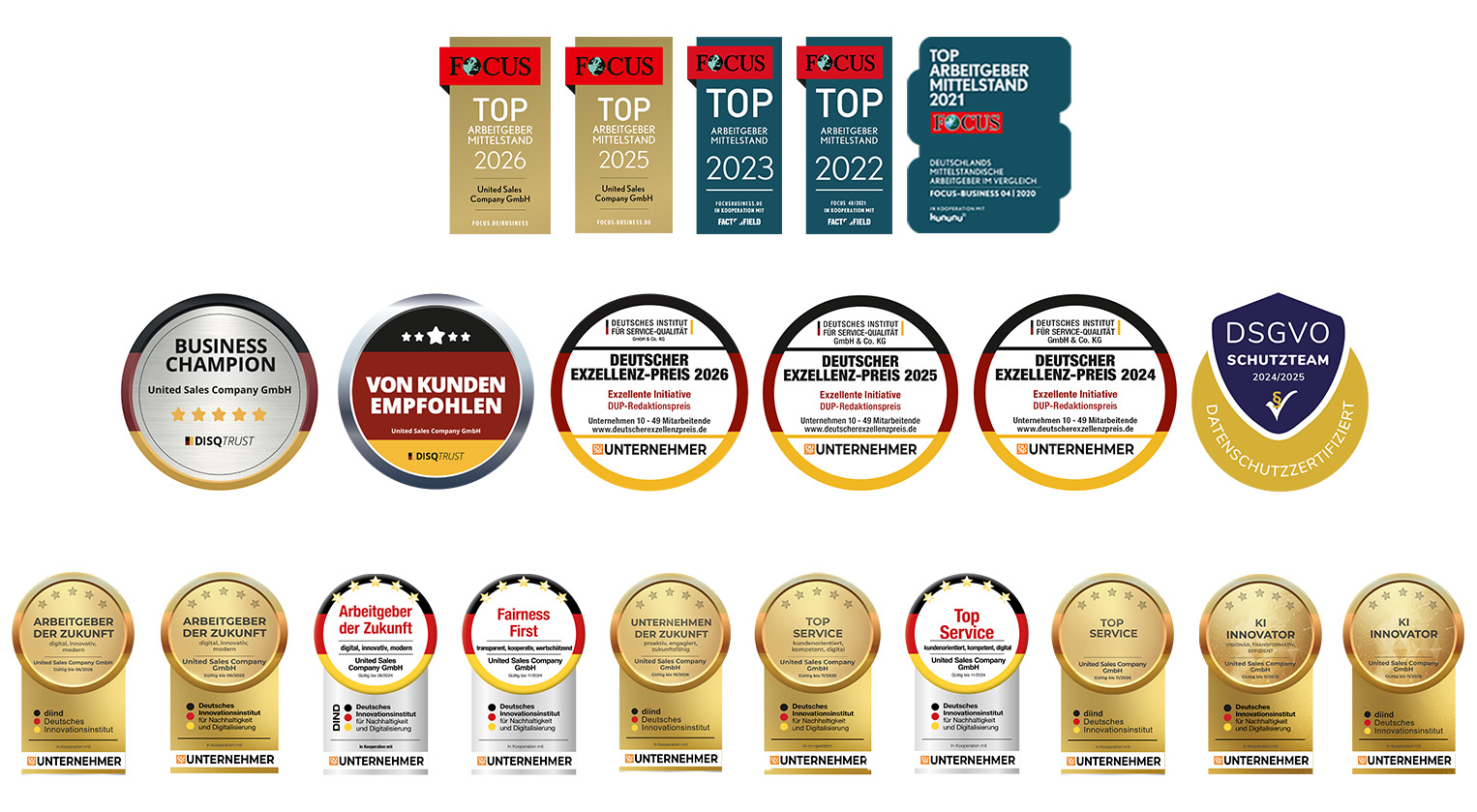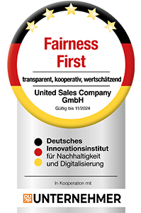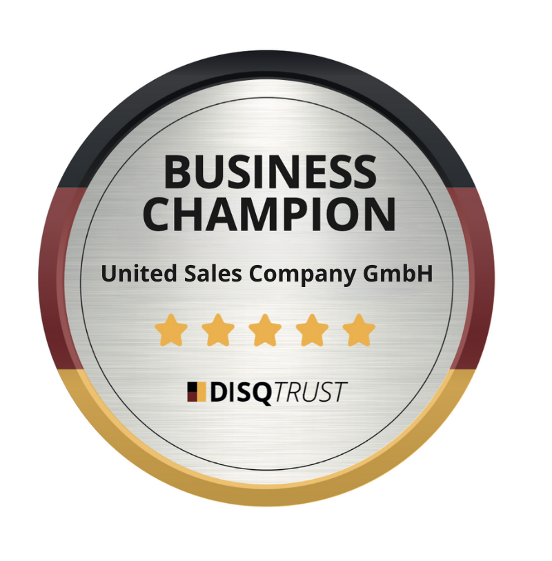 Die United Sales Company wurde mit dem „Business Champion“-Siegel ausgezeichnet und zählt damit zu den Unternehmen, die im Bereich moderner Unternehmensführung besonders überzeugen. Das Siegel wird vergeben von DISQTrust, einer Marke des Deutschen Instituts für Service-Qualität (DISQ). Das Institut steht seit nahezu 20 Jahren für unabhängige Analysen, die die Leistungsfähigkeit deutscher Unternehmen transparent und vergleichbar machen.